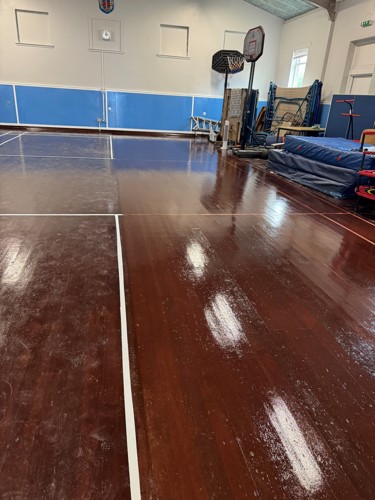 The project involved comprehensive flooring work, which included sanding and preparing the floor surface, applying a hard-wearing floor stainer, varnishing to provide a durable finish, and adding demarcation and white lining on the floor for clear visibility.