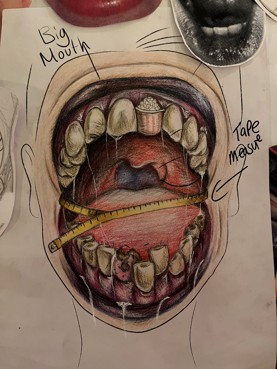 “My favourite look has to be my first ep creative brief look. I created a look based on my secret “binge eating” and I painted an illustration of a huge mouth with a tape measure. I didn’t have enough time at all to finish the centre of the piece, but if I had more time, I would have done it 1000000% better!”